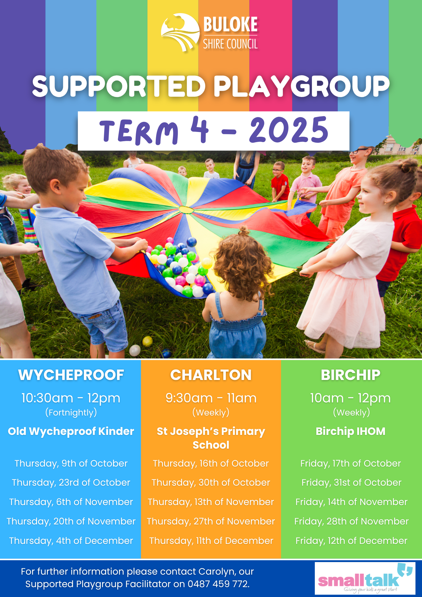For more information, please click the links below to download the Term 3 Supported Playgroup Flyer for Wycheproof, Charlton & Birchip.